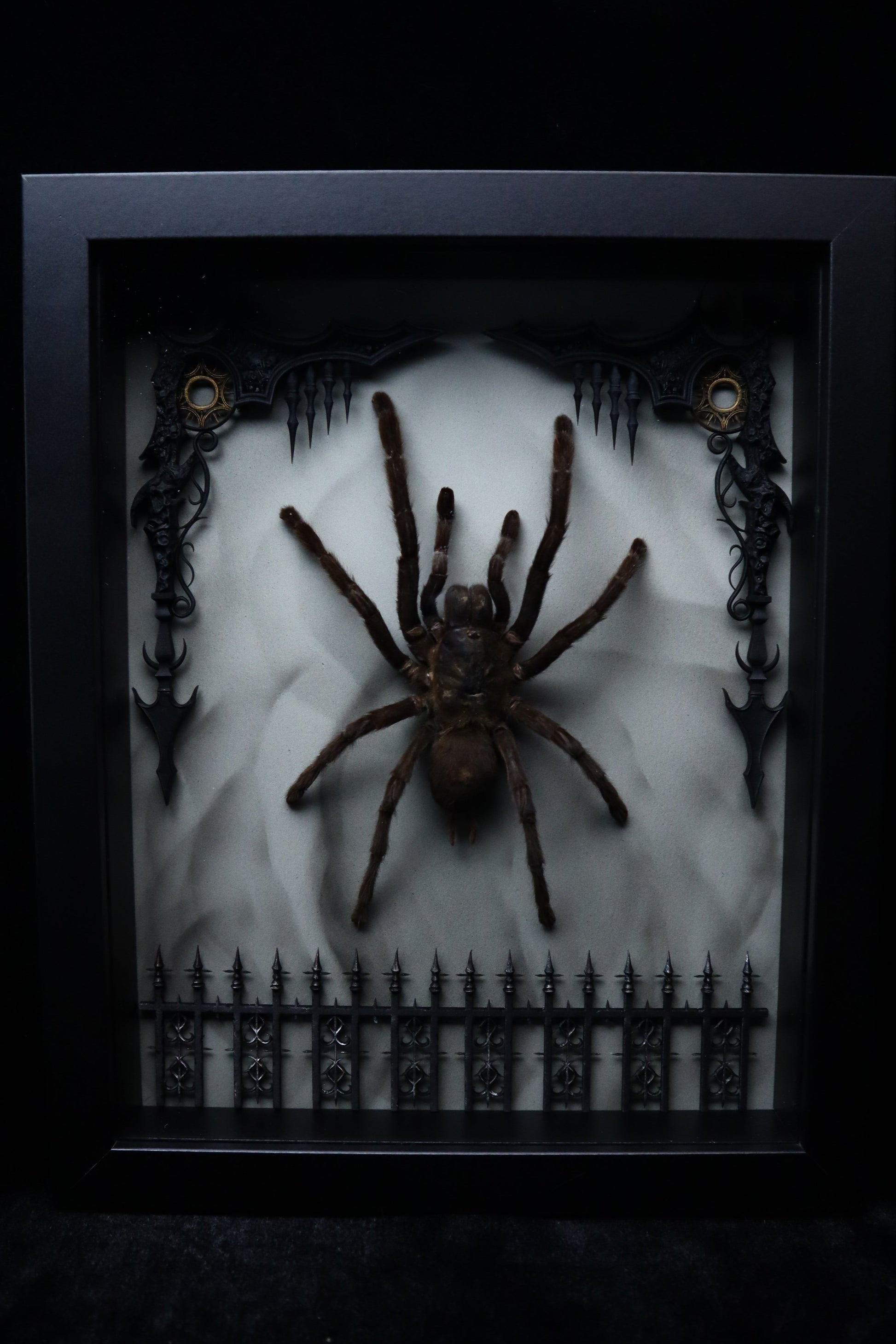 Thai Bird-Eating Tarantula in a mounted in a wooden frame with gothic style embellishments.