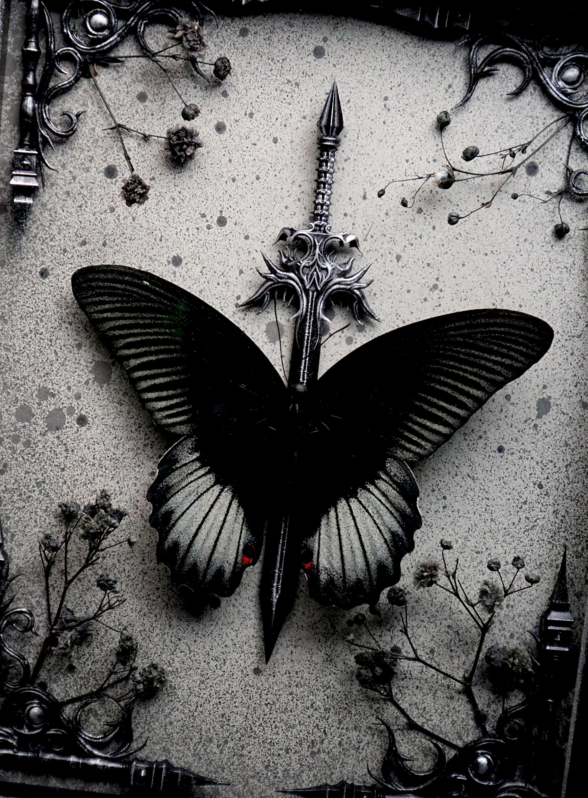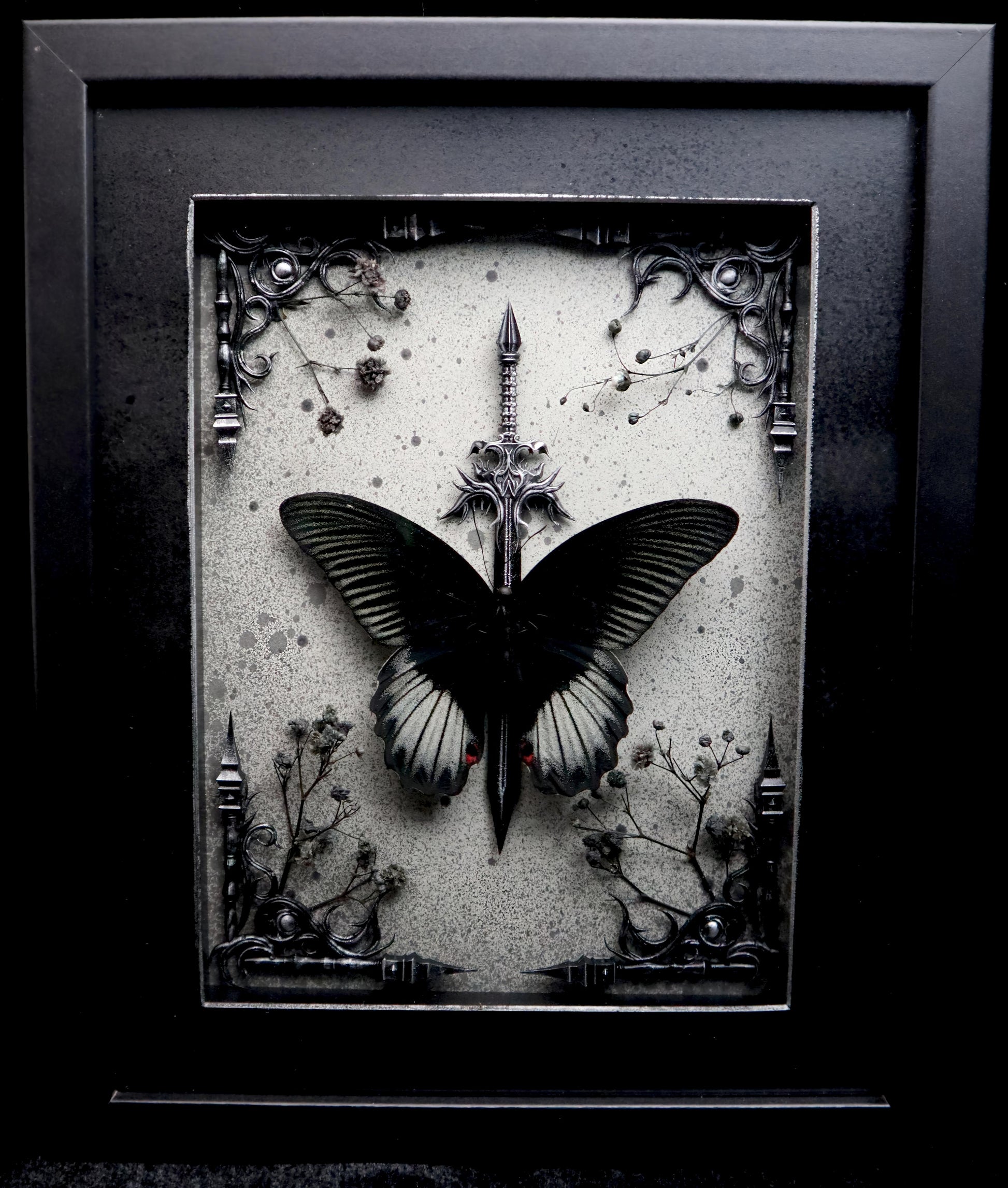 Beautiful Male Scarlett Mormon mounted in a wooden frame with gothic style embellishments.