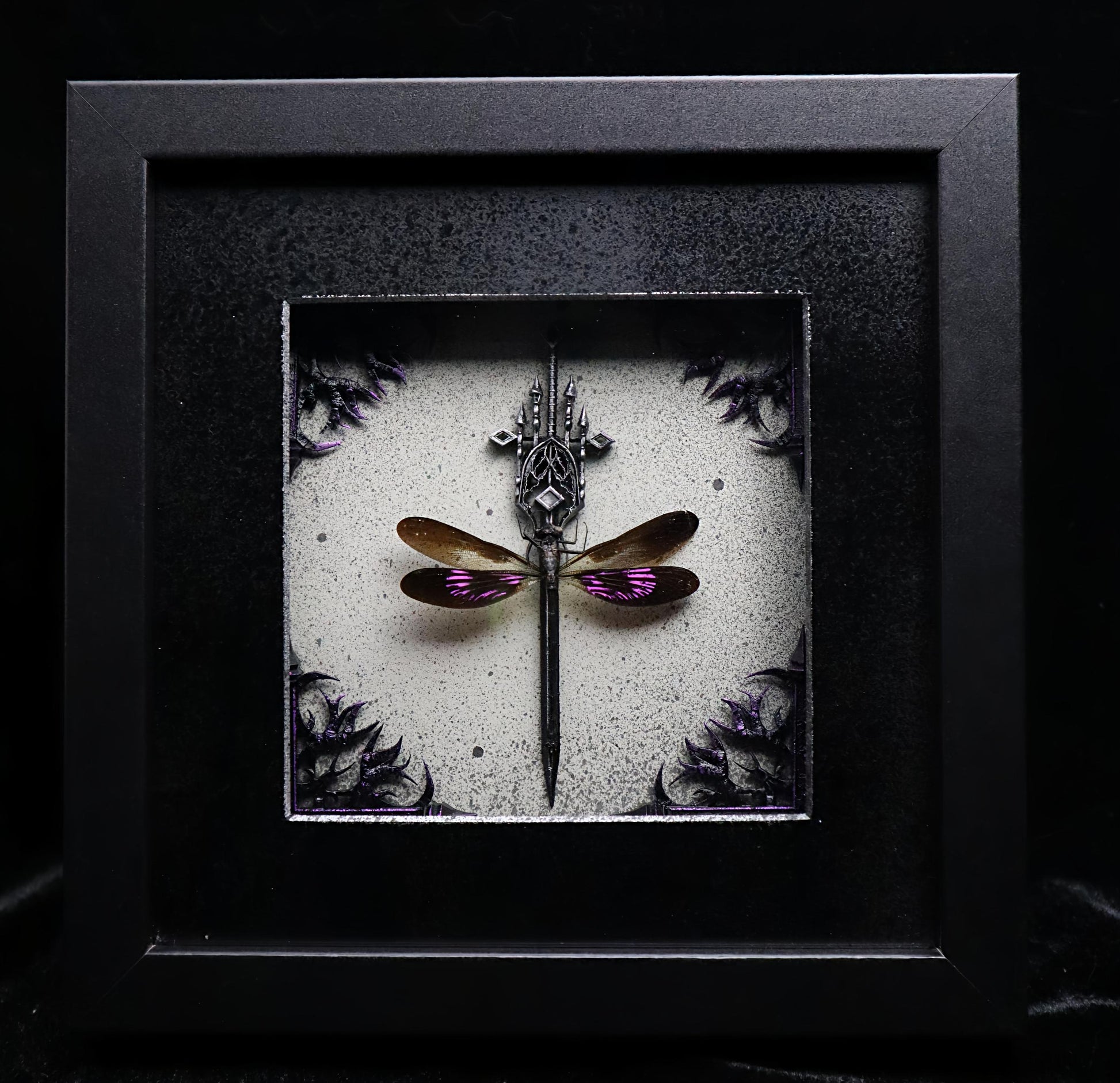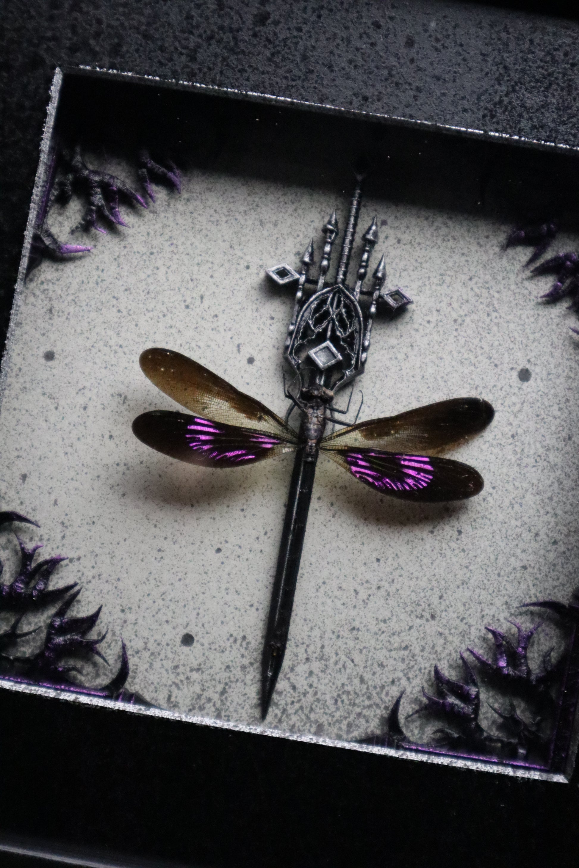 Metallic Purple Damselfly mounted in a wooden frame with gothic style embellishments.