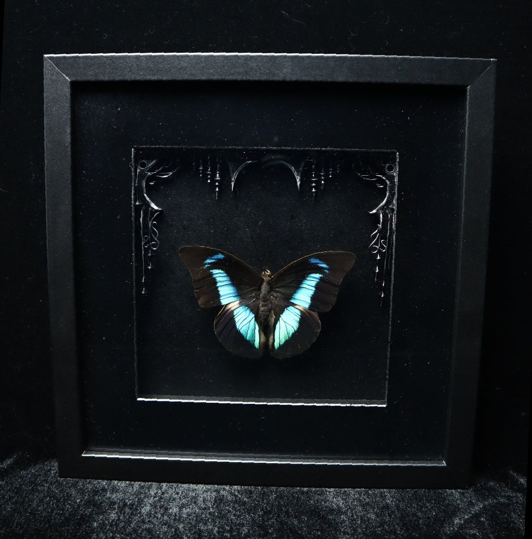 Beautiful Preona Butterfly mounted in a wooden frame with gothic style embellishments.