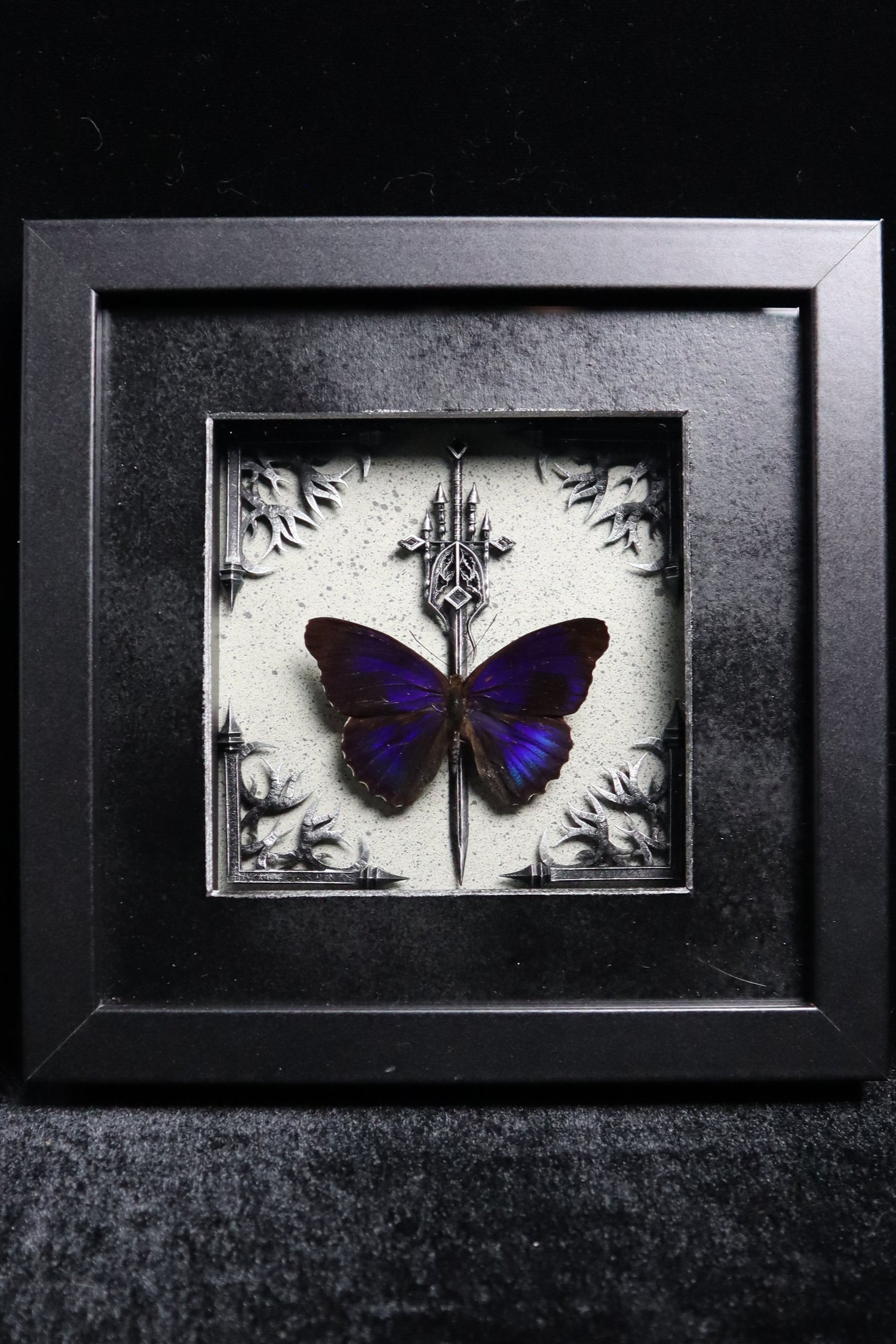 Shining Purple Wing mounted in wooden frame with a black background and silver/black gothic style embellishment